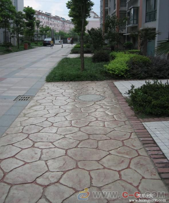 壓模前要事先研究并制訂成型模排列及提放的位置及方向,確保圖案的整體性。將第一塊成型模沿著放樣圖案參照線鋪設(shè),并將其垂直壓進(jìn)混凝土內(nèi)。施工者可以站立在成型模上,人體自身重量足以使成型模能在混凝土表層形成紋理,必要時(shí)可以使用明建成型模專用搗棒把成型模垂直地壓進(jìn)施工面內(nèi),以更好地壓出清楚逼真的圖案。掌握壓模的時(shí)間非常重要,太濕或太干的混凝土表面都會(huì)影響最后的圖案及效。